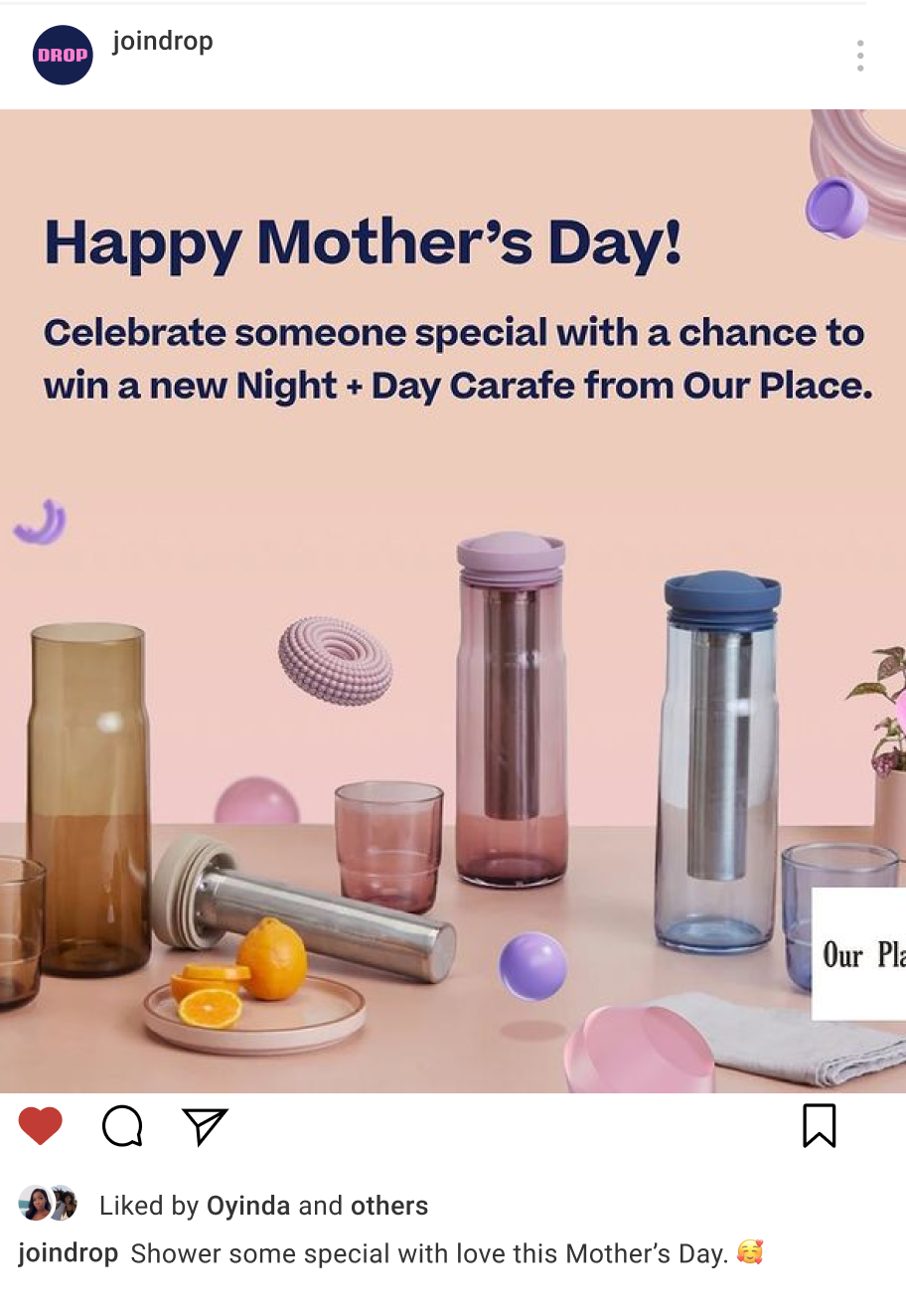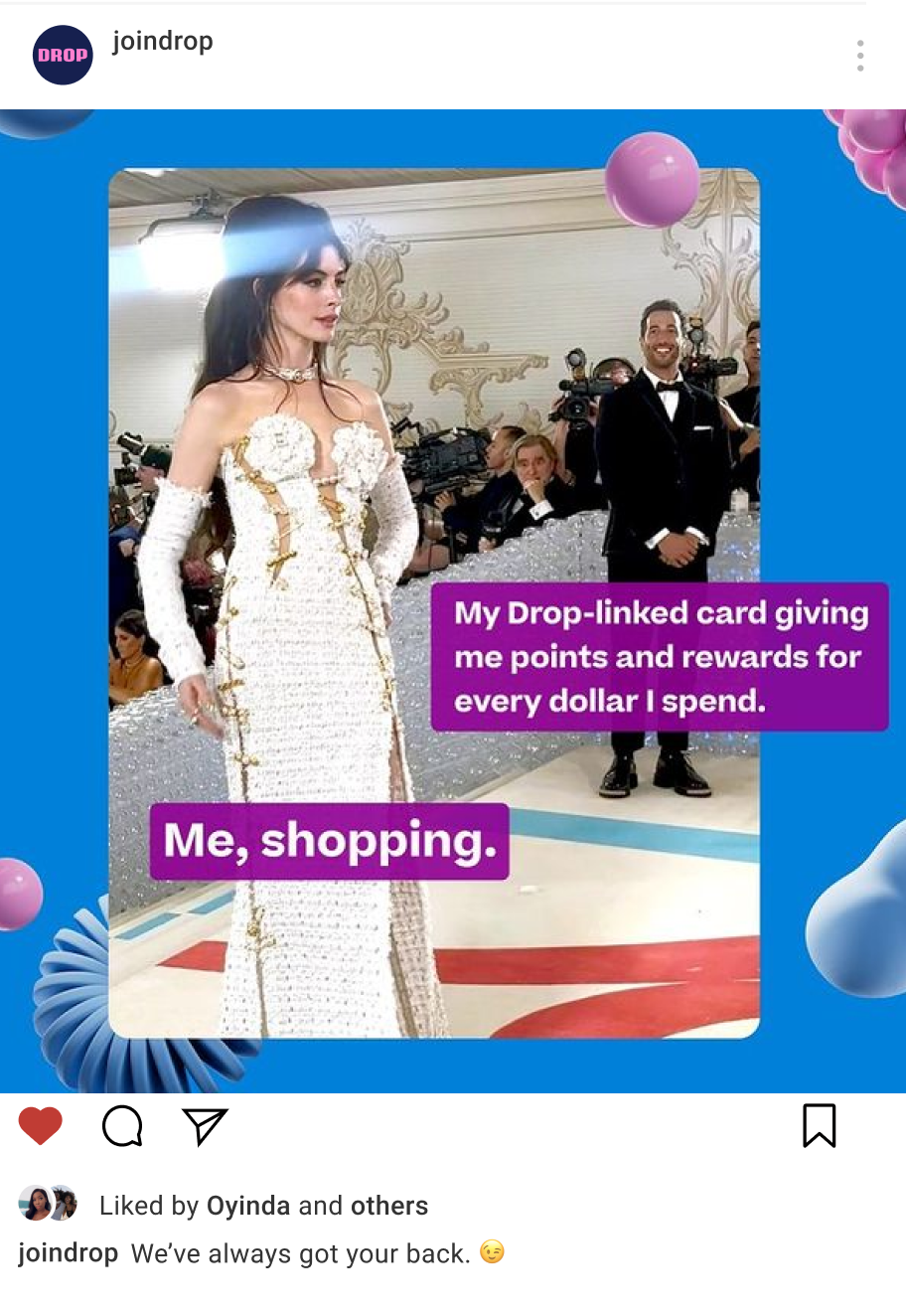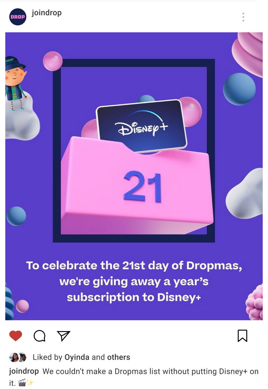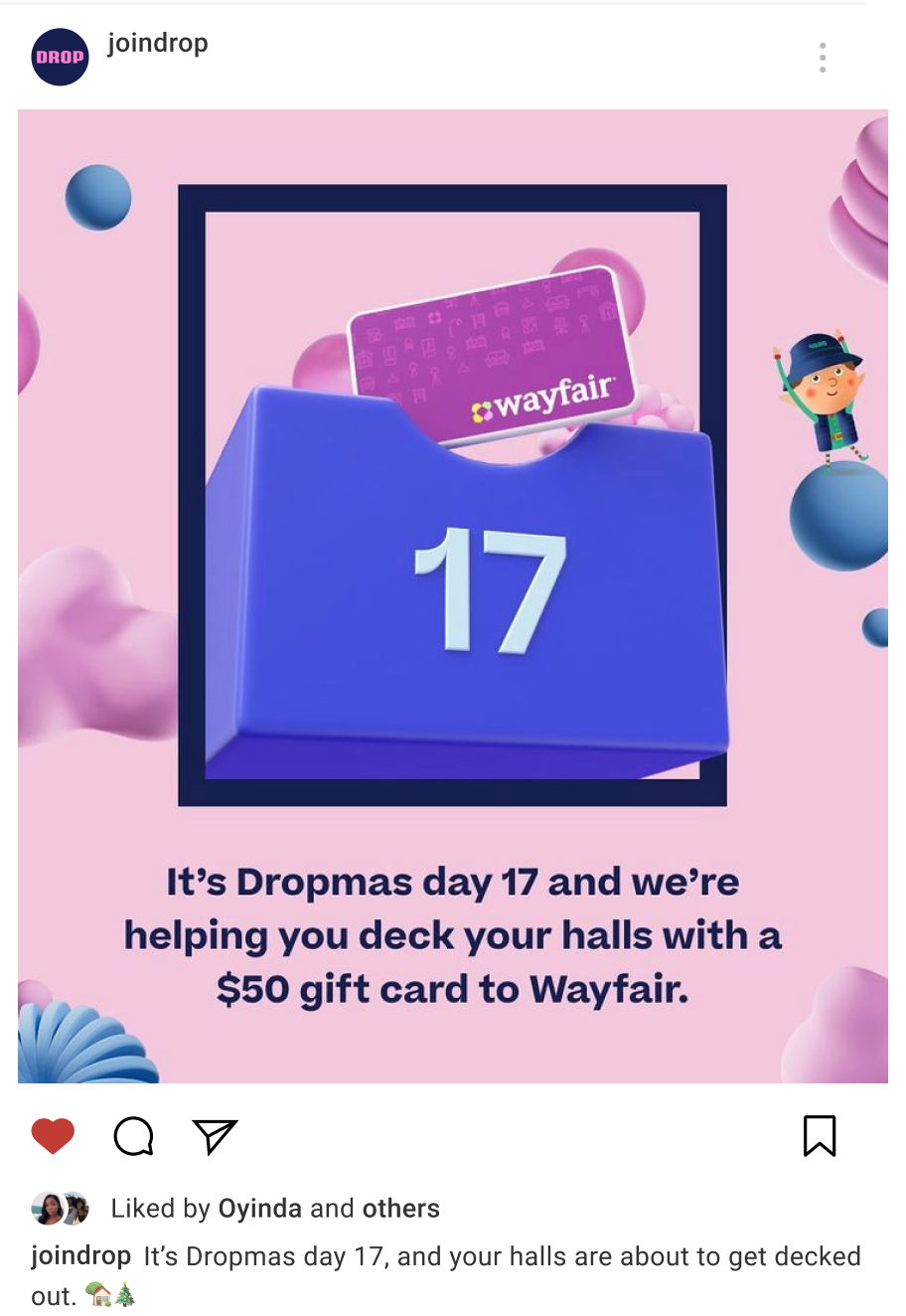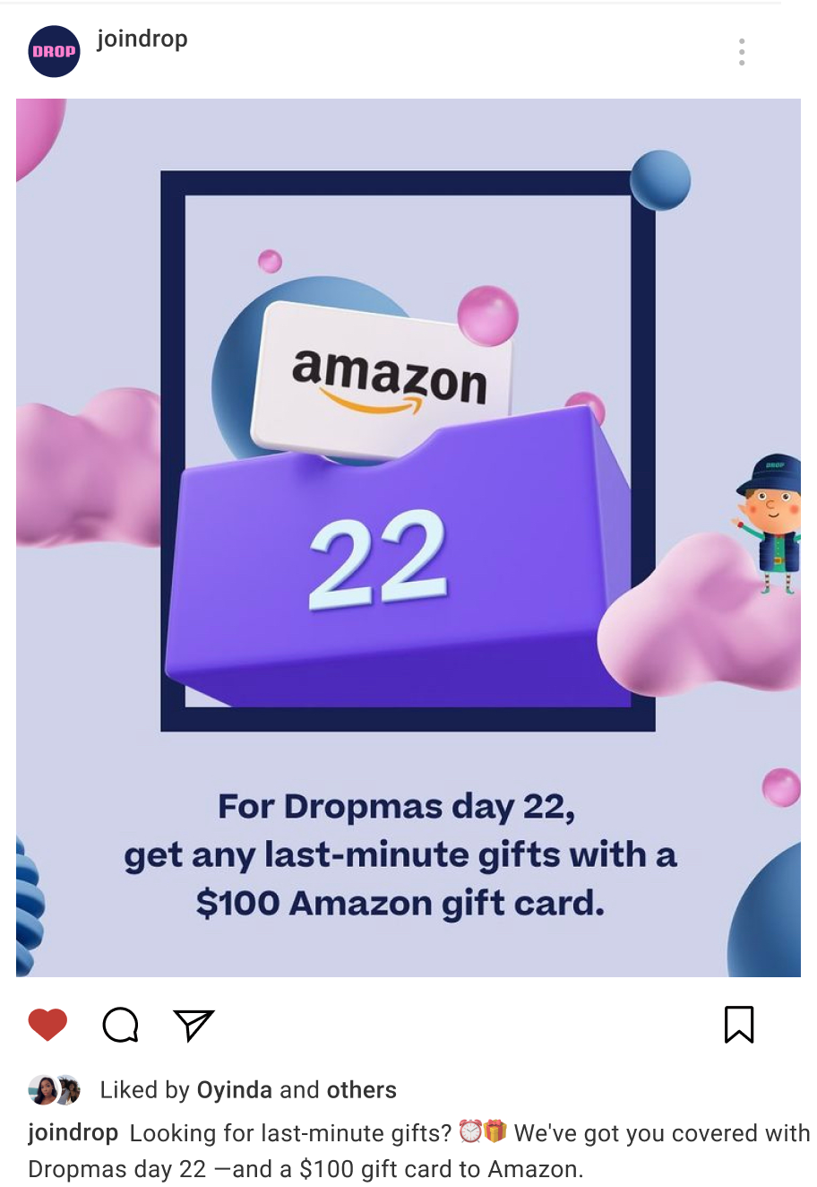 Drop's business model is based on rewarding members with gift cards for their shopping, so we decided to embody this value prop in an authentic way: By giving away gift cards on Instagram at the same time every day for 25 days. The result? Our Instagram engagement and follower count skyrocketed during this campaign, and so did the number of cards linked to the Drop app.