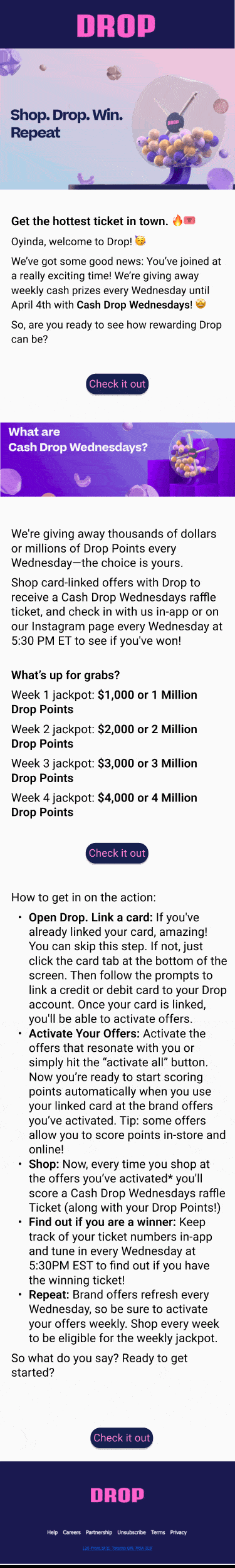 We wanted to create a habit for users to go into the app every Wednesday. So we gave them a reason—a chance to win cash every week. As we increased the prize pool and announced new winners each week, we saw that users began activating their offers more frequently.